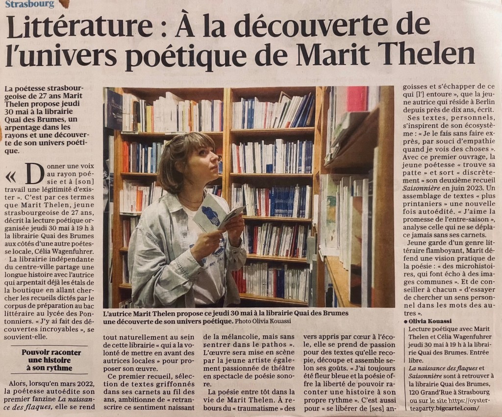 ♡Autrice, comédienne, danseuse, rêveuse et poétesse elle grandit à Strasbourg entre la France et l’Allemagne ce qui la déboussole un peu. Elle découvre lors d’une activité d’entre midi et deux de la cantine ce que c’est que d’écrire et de raconter des histoires, et ça trouve alors bon port dans son imaginaire. C’est avec les personnages qui l’habitent qu’elle décide de combattre le monde qui l’entoure. Perdue dans ses carnets entre les miettes de goûters oubliés et l’angoisse d’une page blanche, c’est assise sur un banc, les yeux dans le vide ou les pieds brûlants sur le lino noir, qu’elle décide de raconter. Belle et bien puissante, Marit nous trimballe avec elle, d’écorchures en réalité rêvée. Ou serait-ce l’inverse? Là, tout bas, à l’intérieur de soi, c’est la rumeur qui sonde et qui gronde, si bas qu’on dirait même qu’elle ronronne… mais ne vous y méprenez pas, l’envie d’écrire, de dire et de se taire est éclatante, quitte à se ramasser. ♡