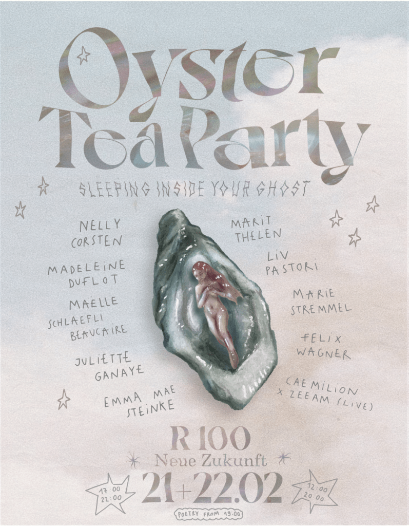 Oyster Tea Party ist ein poetischen multidisziplinarisches Projekt aus Liebe zur DIY-Kunst. Anstelle eines statischen, gedruckten Fanzines, das wir ebenfalls sehr schĂ€tzen, soll Oyster Tea Party einen dynamischen Ort schaffen, an dem Poesie unmittelbar und gemeinschaftlich erlebt werden kann. Zehn KĂŒnstlerInnen & Autorinnen laden dich ein, deren Geschichten ĂŒber «Sleeping Inside your Ghost » zu erzĂ€hlen – ein Zine, das man nicht nur liest, sondern in Echtzeit erlebt. Auf französisch, deutsch & englisch.
