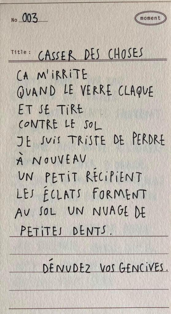 La pluie pleure sur commande Elle doit se pincer la main Dans sa poche Et se concentrer très fort Penser à quelque chose de triste Peut-être Mais sans être mélancolique Parce que ce n’est pas la même chose Ni nostalgique Parce que c’est encore pire Sans oignon qui lui pique les yeux, Juste pleurer sur commande Comme chaque pluie Et chaque jour pluvieux Et chaque envie de renverser Un verre d’eau plate sur une table basse