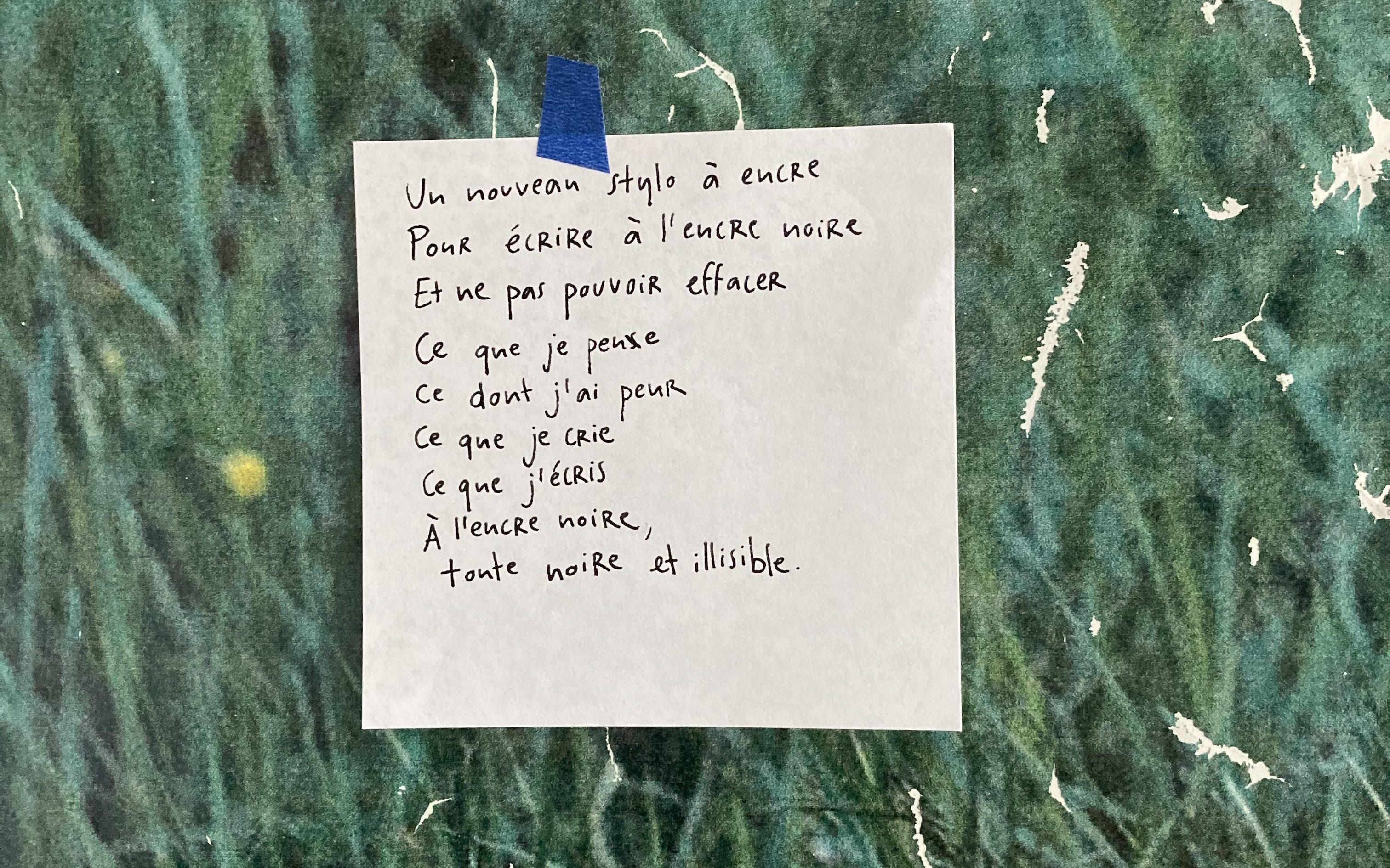 J’apporte une attention particulière aux feuilles de menthe fraîches boursouflées dans un grand verre de thé froid qui gisent éparpillées au fond et sur les parois comme des corps noyés repêchés des mois après l’annonce de leur perte. Sauf que là, les feuilles de menthes dénaturées, tout le monde s’en fout. C’est triste, il faut procéder à l’enterrement. Les entasser au fond du verre avec la longue cuillère du long verre à thé, très fort, et leur faire baver une toute dernière fois leur jus froid.
